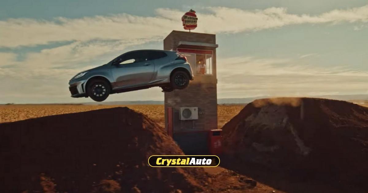 რეკლამაში GR Yaris-ი შორეულ, უკაცრიელ გარემოშია გადაღებული. მძღოლი, რომელსაც რალის ჩაფხუტი აფარია და სარბოლო აღჭურვილობა აცვია, მანქანით ორ გორაკს შორის არსებულ სივრცეს „აფრინდება“. აქ კი წარმოსახვითი საკვები ობიექტიდან, სახელწოდებით Up'n Down Burgers-ი, შეკვეთასაც იღებს.